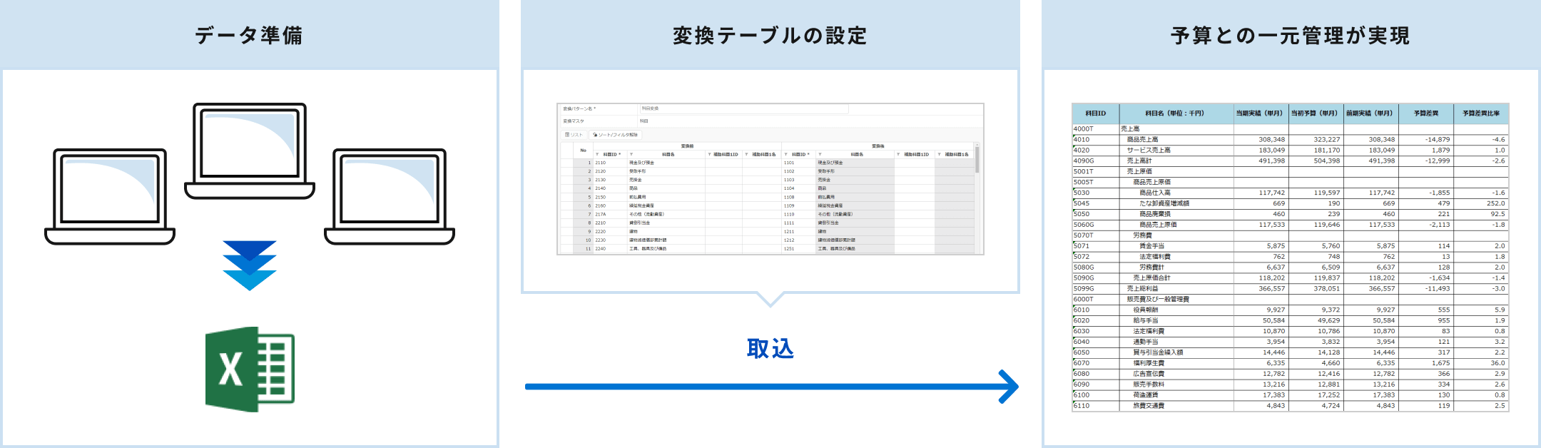 取込時にシステムの情報に変換できるため、予算データとの一元管理が可能です。